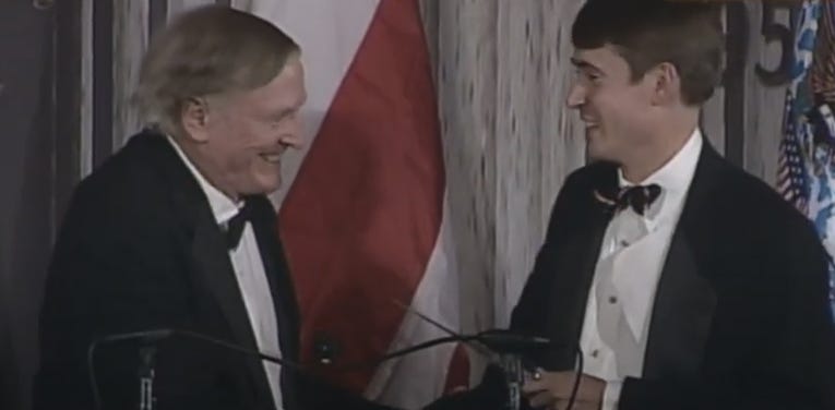 Austin speaks with the same mid-Atlantic accent; he also went to Yale where he joined the Intercollegiate Studies Institute, an organization Buckley founded for right-wing college students; and he gave a fawning speech about Buckley at ISI’s 50th Anniversary Dinner which Buckley attended as the guest of honor.