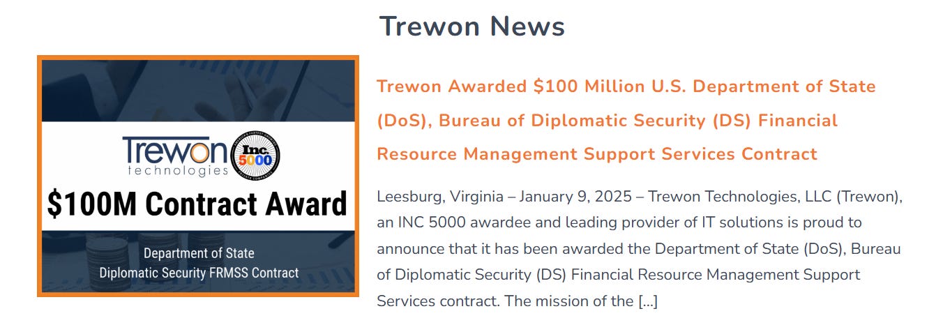 And so was Trewon Technologies, an IT provider for federal agencies. Trewon does millions of dollars of business with the federal government. In fact, this announcement is on Trewon’s home page:
