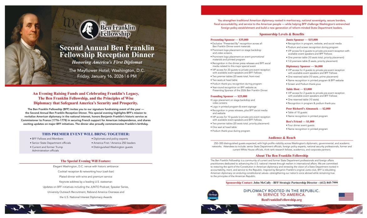 The Ben Franklin Fellowship - or BFF - is a semi-secretive, invite-only club of right-wingers who work in foreign affairs. Its mission is to MAGA-ize U.S. foreign policy and the agencies that execute it (e.g. the State Department, whatever remains of USAID, the U.S. Institute of Peace, USAGM, etc.).